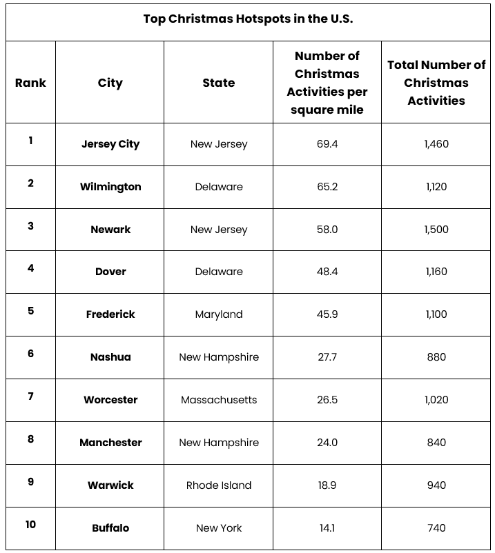 The research crowned Jersey City as the top Christmas hotspot for 2025. Wilmington placed in second, followed by Newark in third. Dover and Frederick make up the rest of the top five.